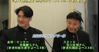 毎月第2火曜日の番組「羽ばたけ!尾道中学校・高等学校」に、普通科総合進学コース3年ラグビー部キャプテン 佐藤麗斗さんと同じくラグビー部 普通科難関コース3年 石川友琉さんが出演。